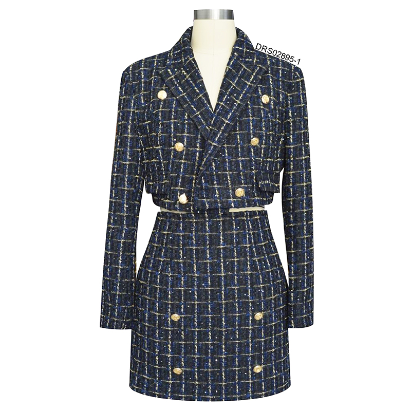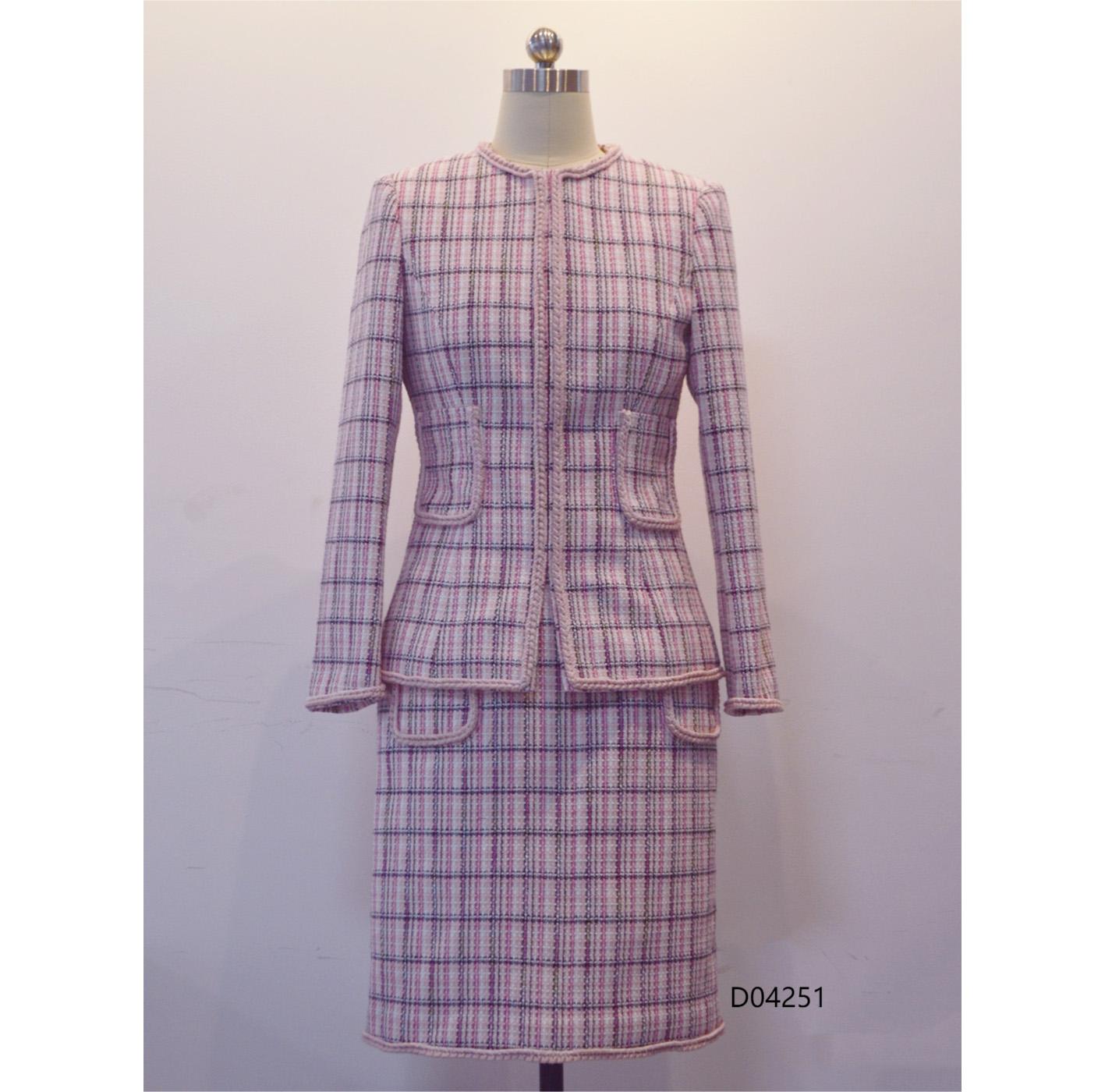 공장 맞춤 도매 핑크 체크 여성 우아한 오피스 정장 스커트 트위드 블레이저 세트